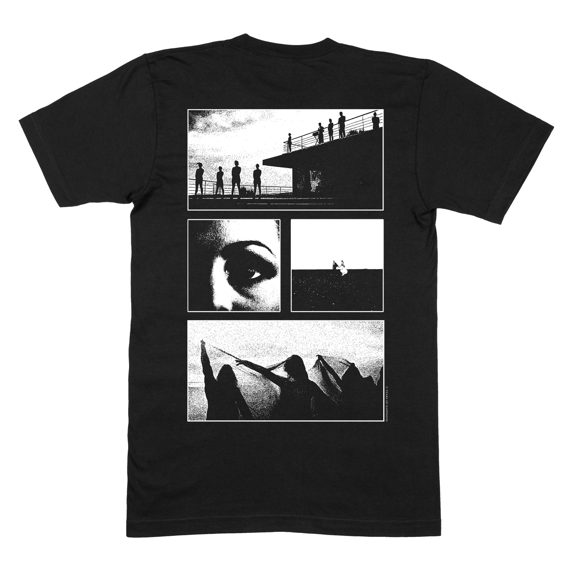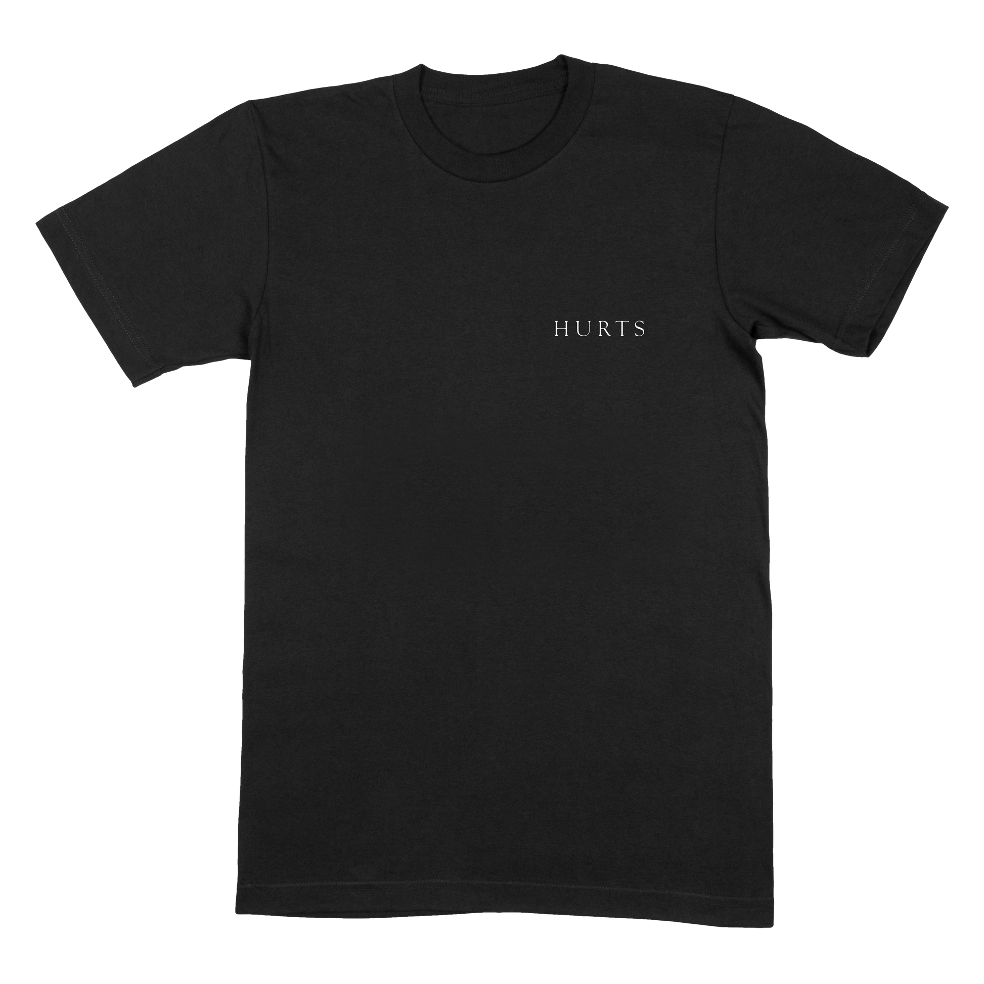 The black Happiness Collection Tee showcases a subtle, pocket-sized Hurts logo on the front, paired with a collage of Happiness album video imagery on the back.