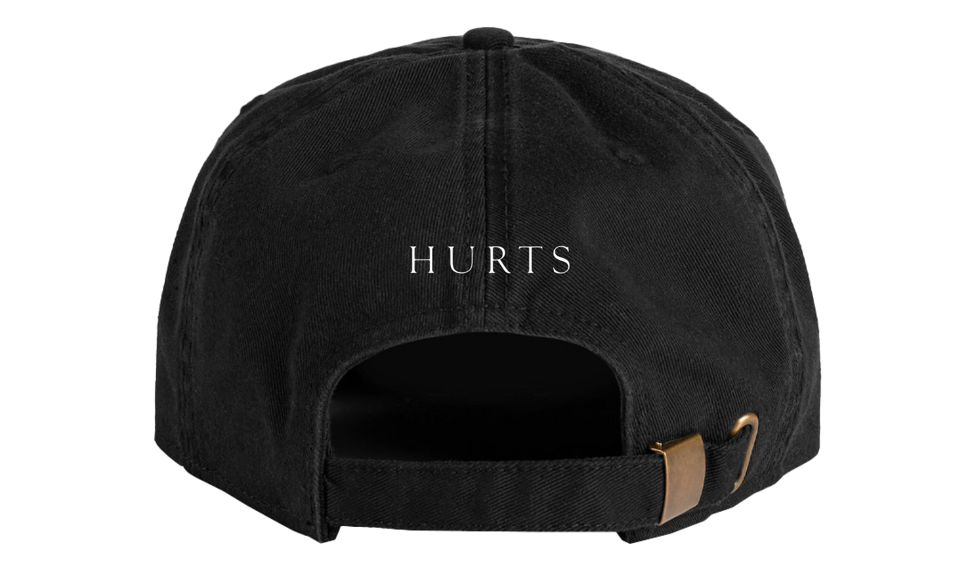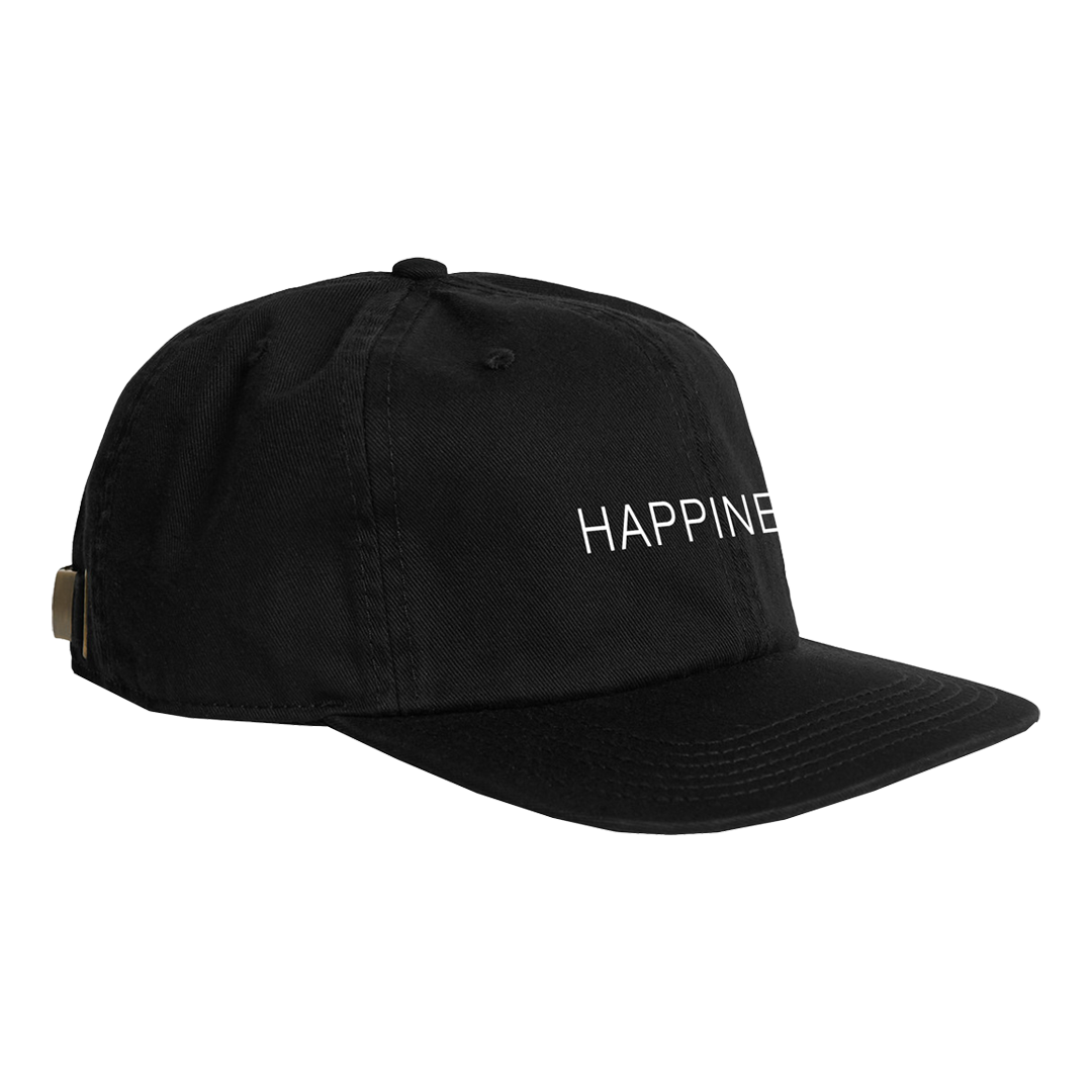 White cotton embroidery details the Happiness Baseball Cap, with ‘Happiness’ on the front and ‘Hurts’ on the back.